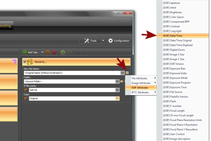 button will open the Attributes menu, where you’ll see various categories to choose from. Each of these categories refers to a different type of image metadata. For this example, we’ll pick EXIF Attributes followed by [EXIF] Date/Time.