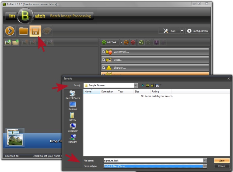 7. After you have named your new context menu item, you will also need to tell ImBatch where to save it, and by what name. Continue by clicking the Save tasks to the file icon in the top-left toolbar of main ImBatch interface window. This will open the Save As window. Here you need to choose where you want to save your new context menu item, give it a file name, and choose what type of file to save it as.