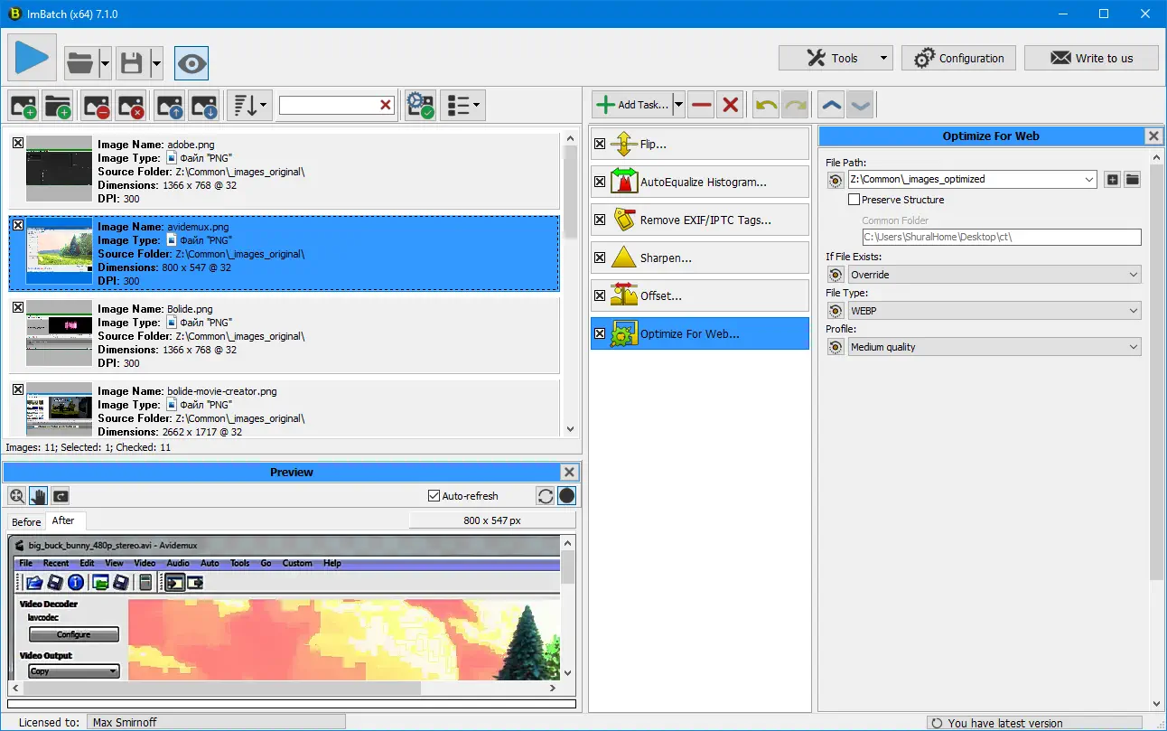 The last task is to add "Save As" or "Optimize for Web". The second task will apply additional optimizations to reduce the image file size and remove all tags. ImBatch can save to the popular WebP format! Do not forget to set a separate output folder in the save task parameters, to not lose the original images due to overwriting.